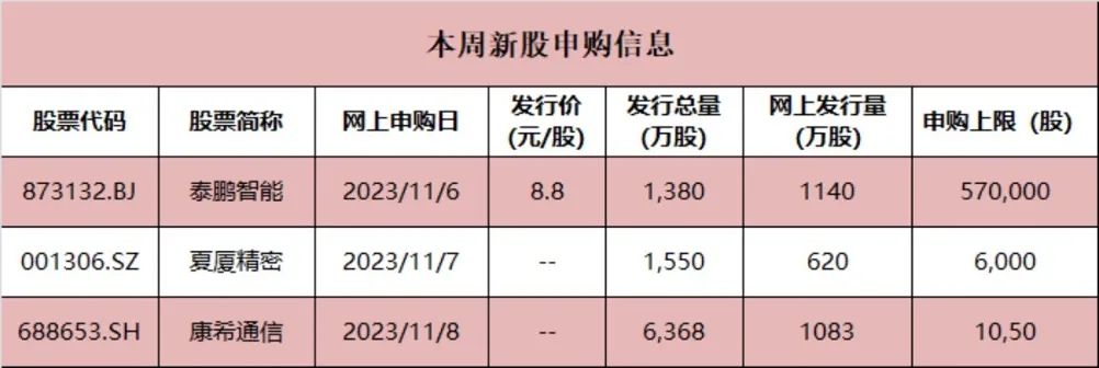 根据发行安排,泰鹏智能将于本周一申购,公司发行价为8.8元/股,夏厦精密将于周二申购,康希通信将于周三申购。