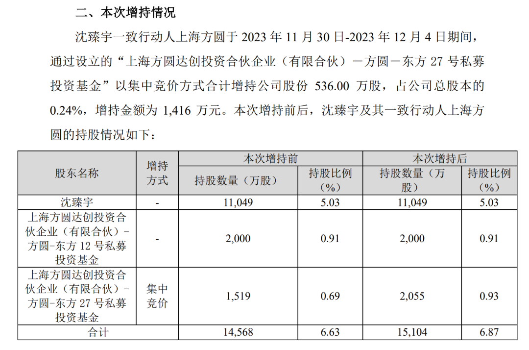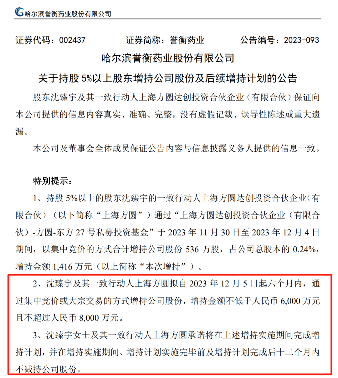据誉衡药业公告,上海方圆通过东方27号私募投资基金于11月30日至12月4日期间,以集中竞价的方式合计增持公司股份536万股,增持金额1416万元。此次增持后,沈臻宇及上海方圆合计持有誉衡药业股份1.51亿股,持股比例为6.87%。总市值逾4亿元。沈臻宇及上海方圆拟自12月5日起六个月内,通过集中竞价或大宗交易的方式增持誉衡药业股份,增持金额不低于6000万元且不超过8000万元。