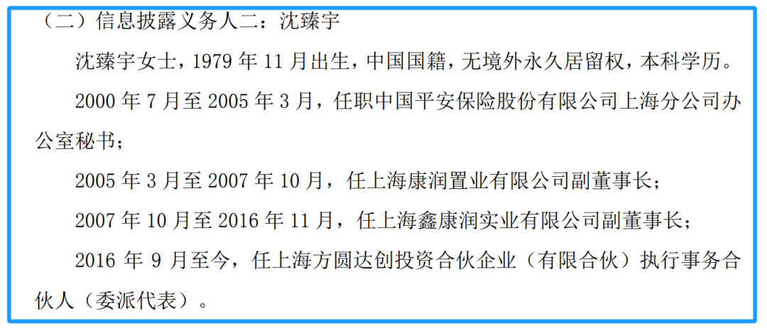 在此次发布的权益变动书中,沈臻宇的信息披露得更加详细。据称,她出生于1979年11月,本科学历。2000年7月至2005年3月,她任职中国平安保险股份有限公司上海分公司办公室秘书。2005年3月至2007年10月,她担任上海康润置业有限公司(下称“上海康润”,现名上海沅晟投资管理有限公司)副董事长。2007年10月至2016年11月,她担任上海鑫康润实业有限公司(下称“上海鑫康润”)副董事长。2016年9月至今,沈臻宇担任上海方圆执行事务合伙人(委派代表)。