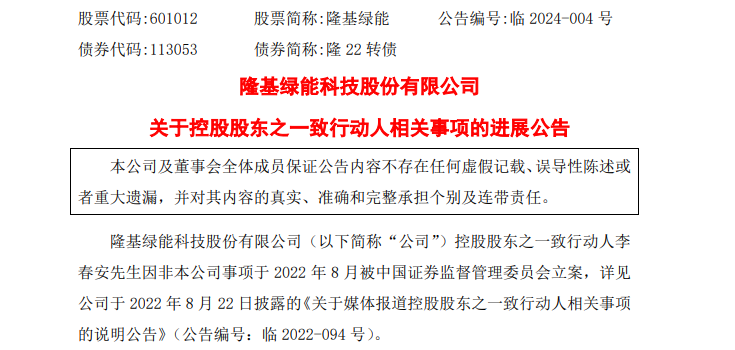 2022年8月被证监会立案后,隆基绿能(601012)控股股东一致行动人李春安涉嫌泄露内幕信息的事项有了新进展。2024年1月29日晚间隆基绿能公告,李春安于当日收到辽宁证监局下发的《行政处罚事先告知书》,拟对其处以50万元罚款。