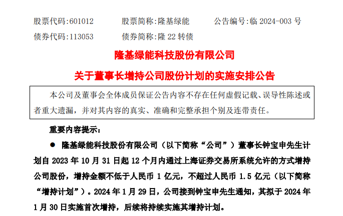 2023年10月隆基绿能公告,基于对公司未来持续稳定发展的信心和长期投资价值的认可,为维护股东利益,增强投资者信心,公司董事长钟宝申计划自2023年10 月31日起12个月内通过上海证券交易所系统允许的方式增持公司股份,增持金额不低于1亿元,不超过1.5亿元。