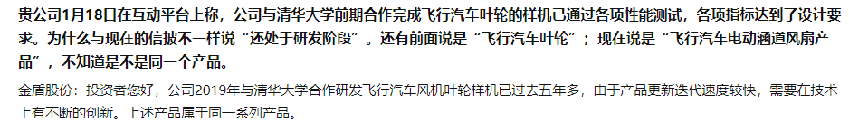 金盾股份起初表示已同清华大学合作完成飞行汽车叶轮的样机研发,并称样机已通过各项性能测试,各项指标达到了设计要求,正在推动项目的产业化。