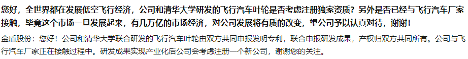 3月中旬,金盾股份对投资者称,公司与清华大学联合研发的飞行汽车涵道风扇与推进系统技术还处于研发阶段。