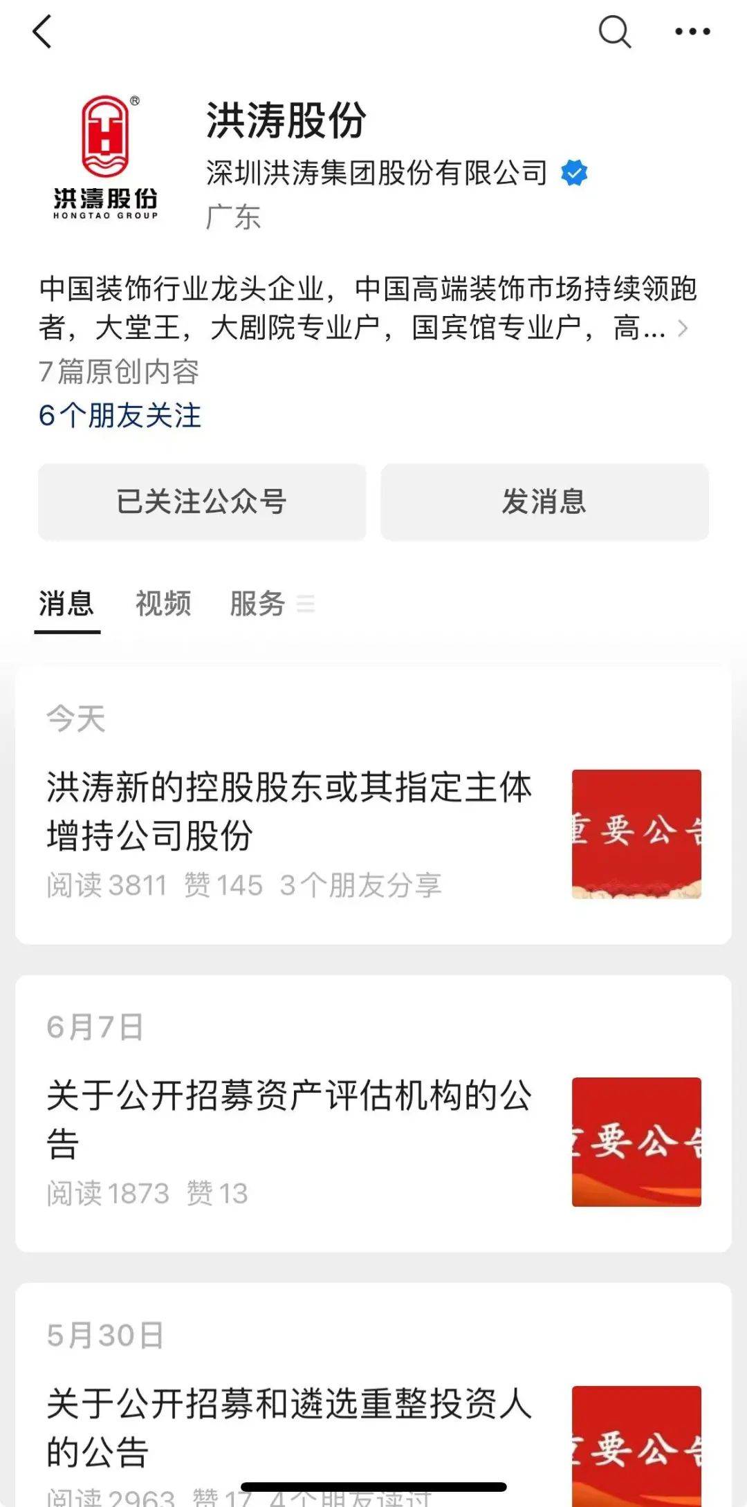 *ST洪涛公告显示,5月29日,临时管理人已按相关法规通过全国企业破产案件信息网向公司债权人发出债权申报通知;5月31日,临时管理人按《中华人民共和国企业破产法》等相关规定,决定公开招募和遴选洪涛集团重整投资人,已通过全国企业破产案件信息网发布《深圳洪涛集团股份有限公司临时管理人关于公开招募和遴选重整投资人的公告》《关于深圳洪涛集团股份有限公司预重整公开招募资产评估机构的公告》,重整工作正在有序推进中。