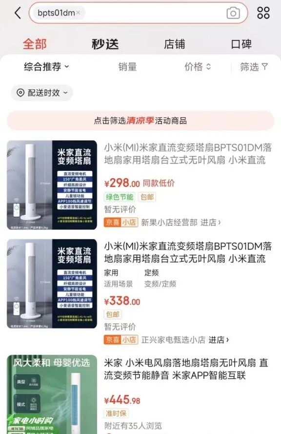 e公司记者在多个电商平台搜索小米电风扇BPTS01DM,截至记者发稿,京东商城目前有第三方网店在售,小米商城已经没有这一型号的产品在售,淘宝商城有这一型号的原装配件在售。