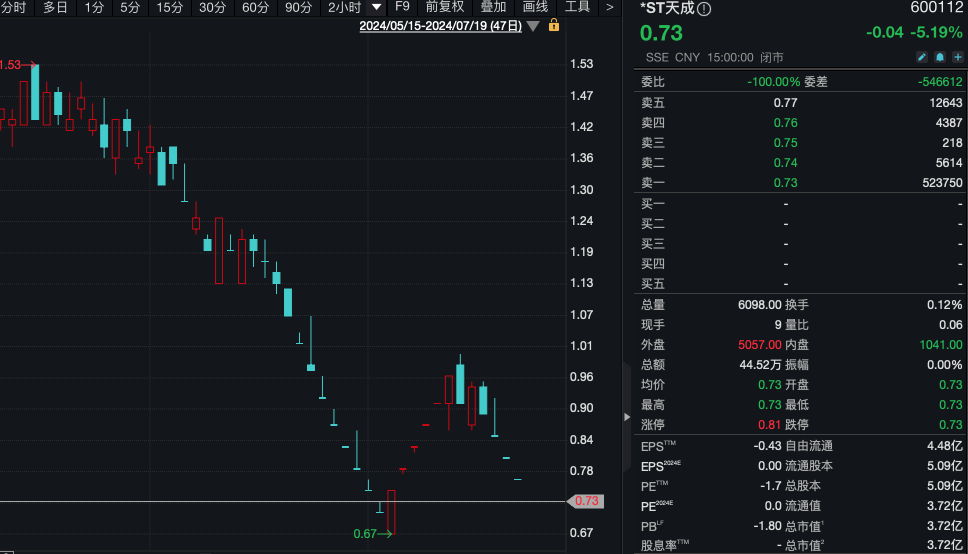 另外,公司股票2024年7月19日收盘价为0.73元/股,自2024年6月24日至7月19日已连续20个交易日收盘价低于1元。