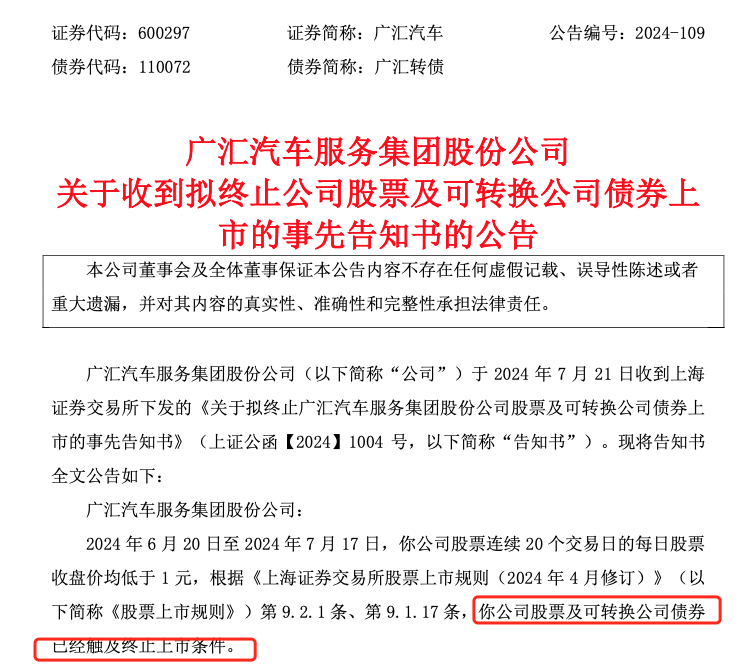 该告知书显示,2024年6月20日至2024年7月17日,广汇汽车股票连续20个交易日的每日股票收盘价均低于1元,根据上交所相关规则,该公司股票及可转换公司债券已经触及终止上市条件。