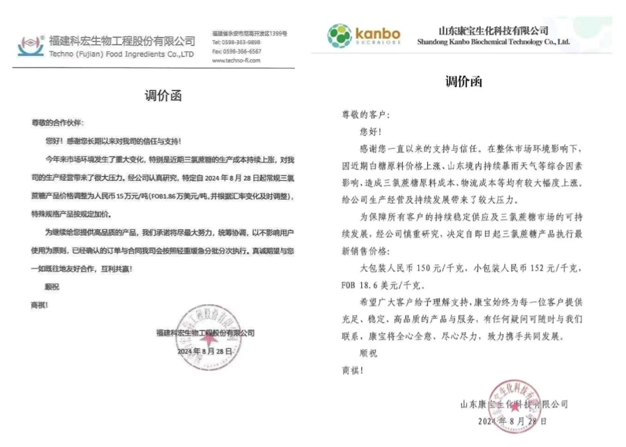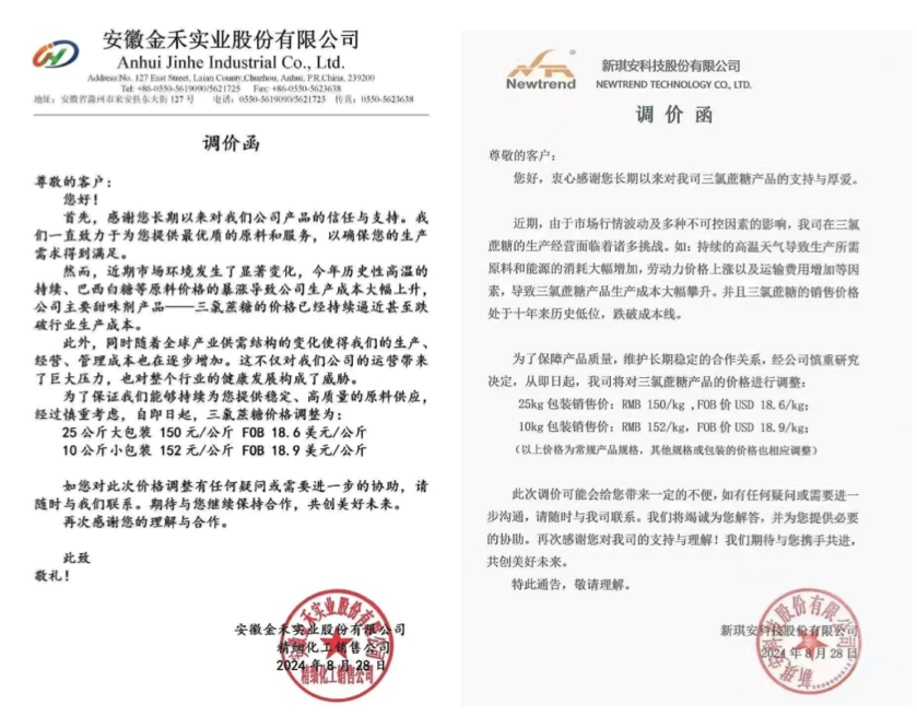 涨价原因为持续高温天气、原料价格暴涨、生产/经营/管理成本承压。 金禾实业公司下属精细化工销售公司今日向客户下发调价函,公司主要甜味剂产品三氯蔗糖价格上调为:25公斤大包装150元/公斤(离岸价格18.6美元/公斤)、10公斤小包装152元/公斤(离岸价格18.9美元/公斤)。