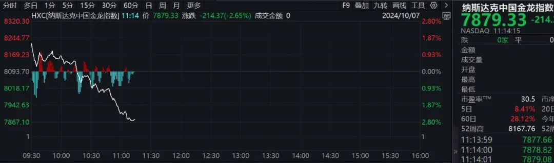 中概股高开低走,纳斯达克中国金龙指数盘初一度涨逾1.5%,再创阶段新高,盘中大幅跳水,截至发稿,该指数下跌逾2.6%。