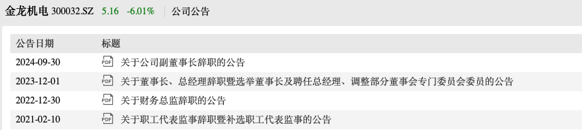 证券时报·e公司记者发现,金龙机电过去三年,曾有董事长、副董事长、财务总监辞职过。不过2023年,金龙机电只披露过一份有关董监高的辞职公告,即2023年11月29 日,公司收到公司董事长、总经理黄磊递交的书面辞职报告。黄磊因个人身体原因申请辞去公司董事、董事长、董事会相关专门委员会委员、薪酬与考核委员会委员及总经理职务,不再代行董事会秘书职责。辞职后,黄磊将不在公司担任任何职务。