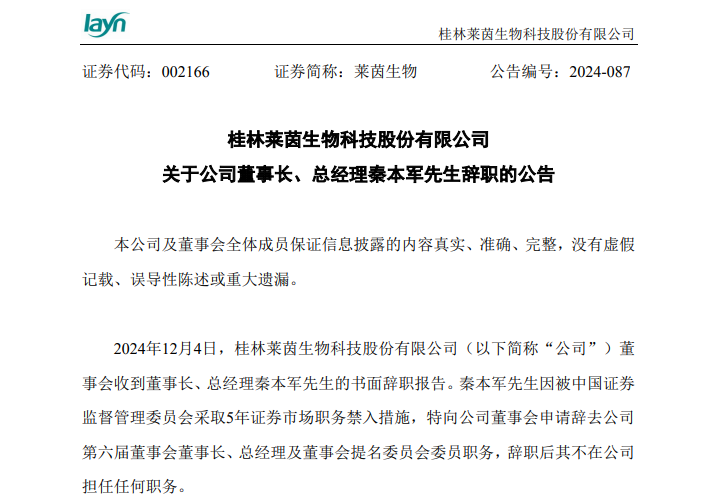 如今随着《行政处罚决定书》落地,秦本军也宣布辞去莱茵生物董事长、总经理及董事会提名委员会委员职务,辞职后其不在公司担任任何职务。莱茵生物公告同时提到,鉴于董事长、总经理选举工作尚需履行相应的法定程序,为保证公司日常经营决策的顺利开展,由公司半数以上董事共同推举董事谢永富代行董事长、总经理及董事会提名委员会委员职务,直至选举产生新任董事长为止。