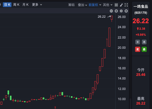 在连续10个交易日涨停后,一鸣食品股价涨至上市以来的最高点,12月9日,该公司股价再次涨停,收报26.22元/股,达到其2020年12月28日上市以来的最高点。