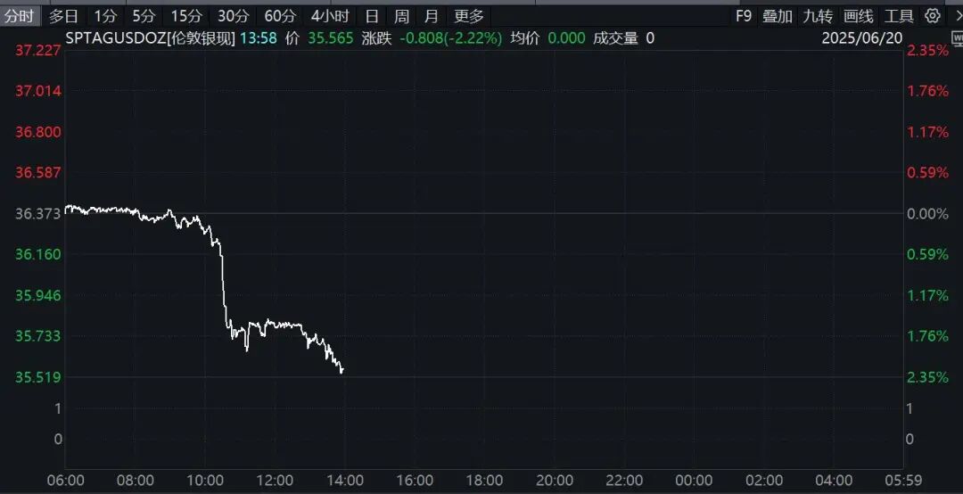今日黄金、白银均走弱。现货白银盘中跳水,一度跌超2%。