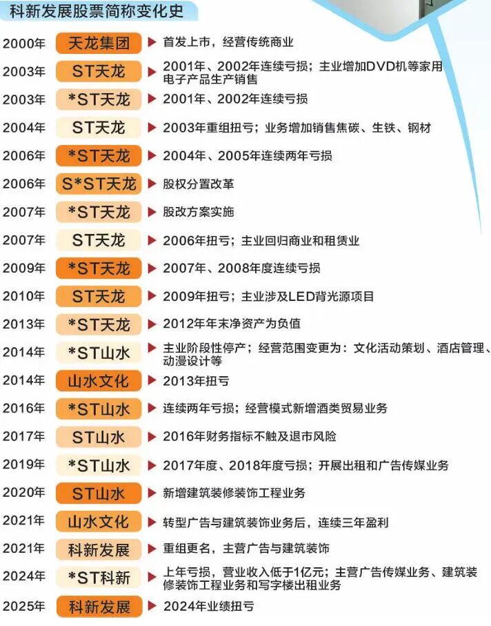 多年来,天龙股份先后更名山水文化、科新发展,在2007年、2010年、2014年、2017年、2020年及2025年均分别发布“撤销退市风险警示”的公告,7次完成保壳。