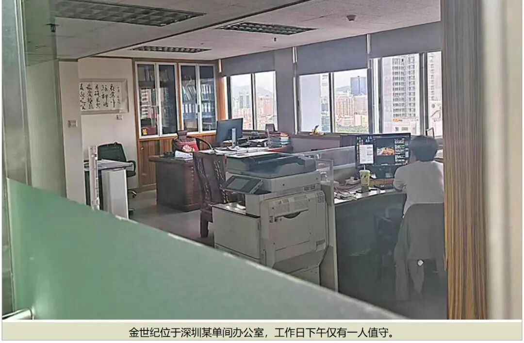 金世纪位于深圳市罗湖区一写字楼的单间办公室内。一个工作日下午,记者前往该公司,看到室内有五六个工位,仅有一人值守。