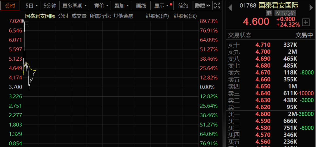 热门个股方面,港股国泰君安国际在昨天大涨近200%的基础上大幅高开,并且直线拉升至一度涨近90%,之后迅速回落,一度翻绿转跌。截至发稿,涨幅约为24%。开盘1个小时内,该股即成交超过100亿港元。