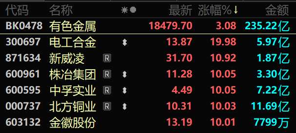 有色金属概念早间全线走强,板块指数放量高开高走涨近3%,创近8个月来新高,半日成交接近昨日全天成交。电工合金开盘仅约3分钟就垂直20%涨停,株冶集团、北方铜业、金徽股份亦强势涨停。