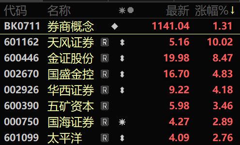 券商股亦强势拉升,板块指数盘中也一度涨逾3%,同样创年内新高。天风证券涨停,近3个交易日2涨停;华西证券、国海证券、太平洋等涨幅居前。