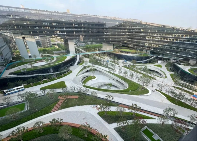踏入园区,记者看到,建筑以“口”字环形将中心花园包围其中,四座造型灵动的裙楼宛如起伏的 “城市山丘”,颠覆了传统科技园区的刻板形象。其创新的“群筒-斜拉结构”在国内尚属首创,整个园区使用的钢结构总量相当于1.5个鸟巢体育场。