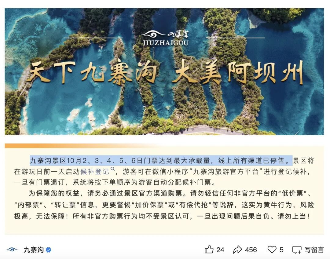 九寨沟景区10月2日-6日的门票达到最大承载量,线上所有渠道已停售。