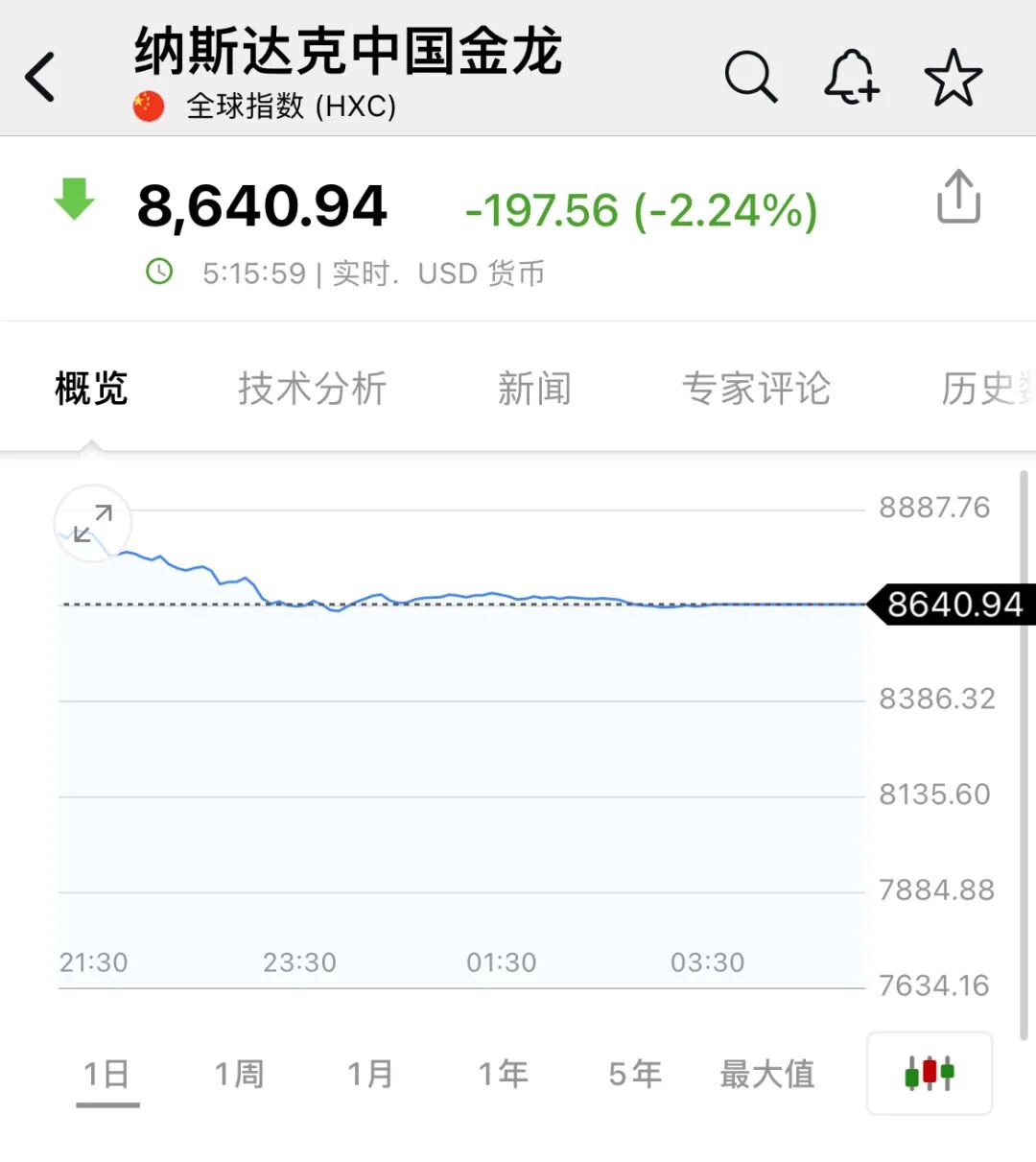 纳斯达克中国金龙指数收跌2.24%,热门中概股普跌,世纪互联跌超6%,万国数据跌超5%,百度跌超4%,阿里巴巴、金山云跌超3%,哔哩哔哩跌近3%,京东、名创优品、理想汽车跌超2%。