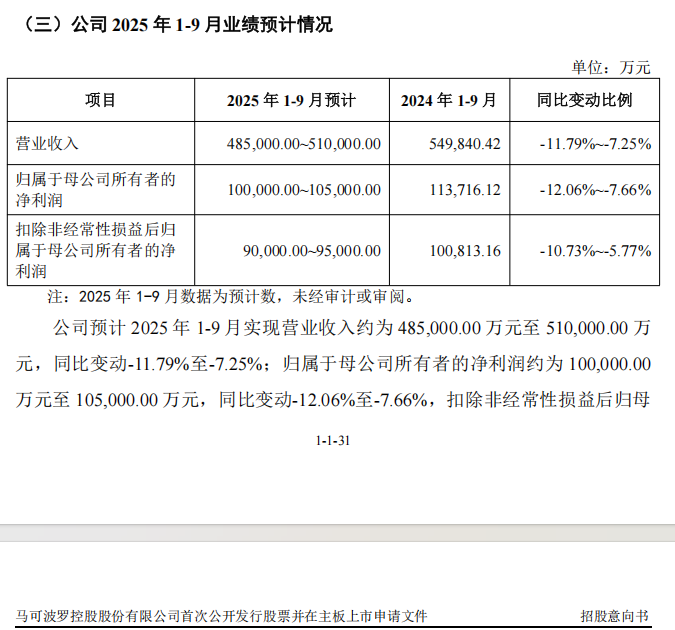 马可波罗的业绩受建筑行业竞争加剧影响。马可波罗预计,公司2025年前三季度的营业收入为48.50亿元至51亿元,同比变动比例为-11.79%至-7.25%;归母净利润为10亿元至10.50亿元,同比变动比例为-12.06%至-7.66%。