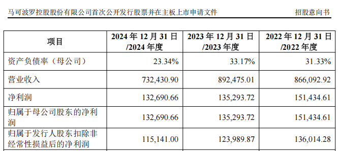2022年至2024年,马可波罗的营业收入分别为86.61亿元、89.25亿元、73.24亿元,归母净利润分别为15.14亿元、13.53亿元、13.27亿元。