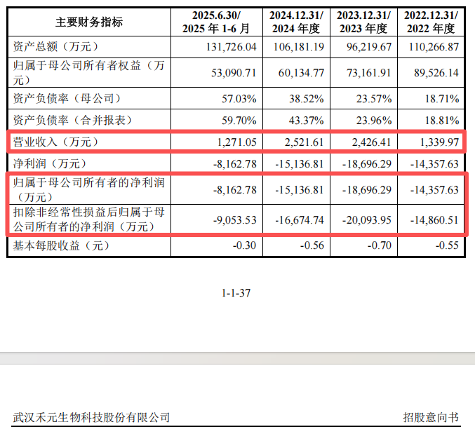 2022年至2024年及2025年上半年,禾元生物的营业收入分别为1339.97万元、2426.41万元、2521.61万元及1271.05万元,归母净利润分别为-1.44亿元、-1.87亿元、-1.51亿元及-8162.78万元。