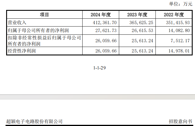 2022年至2024年,超颖电子的营业收入分别为35.14亿元、36.56亿元、41.24亿元,归母净利润分别为1.41亿元、2.66亿元、2.76亿元。