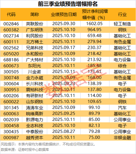 英联股份预计净利润增幅最高,预计前三季度实现净利润增幅中值为1602.05%;广东明珠、利民股份预计前三季度净利润同比增幅中值分别为964.95%、659.48%,位列第二、第三。