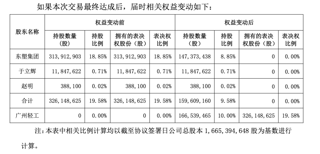 截至目前,东塑集团为沧州明珠控股股东,于桂亭为沧州明珠实际控制人。据公告,东塑集团及其一致行动人拟将持有的公司剩余1.6亿股股份(占协议签署日公司总股本的9.58%)对应的表决权委托给广州轻工,广州轻工拟通过直接持股联合表决权委托的方式获得公司19.58%股份表决权。