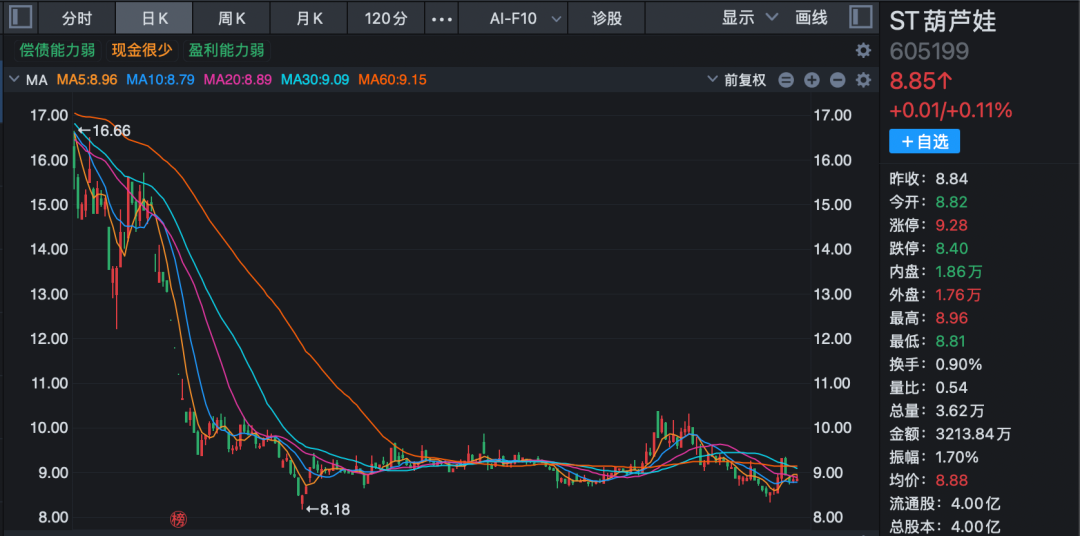 ST葫芦娃股票自2025年4月30日起被实施其他风险警示,主要因其2024年度内部控制被立信会计师事务所(特殊普通合伙)出具了否定意见的《内部控制审计报告》。受此消息影响,该公司当时股价大跌。