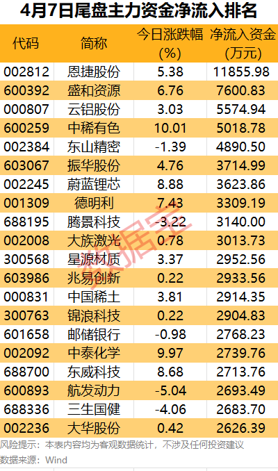 盛和资源、云铝股份、中稀有色、东山精密、振华股份尾盘主力资金净流入均超0.3亿元。
