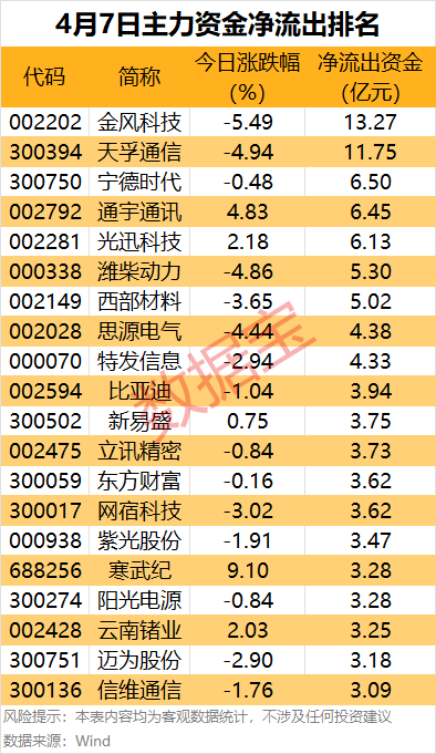 从尾盘净流出来看,天孚通信、金风科技、光迅科技等4股尾盘主力资金净流出均超1亿元。