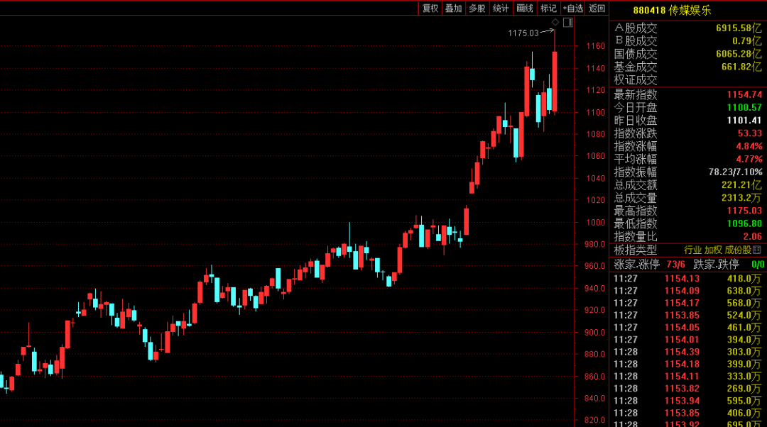 传媒娱乐板块早盘单边飙升逾6%,创两年半来新高,亦创多年来单日最大涨幅,半日成交超昨日全天成交。实际上,传媒娱乐板块已连续6个月上涨,累计涨幅超50%,是同期涨幅最凌厉的板块之一。