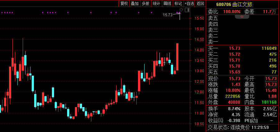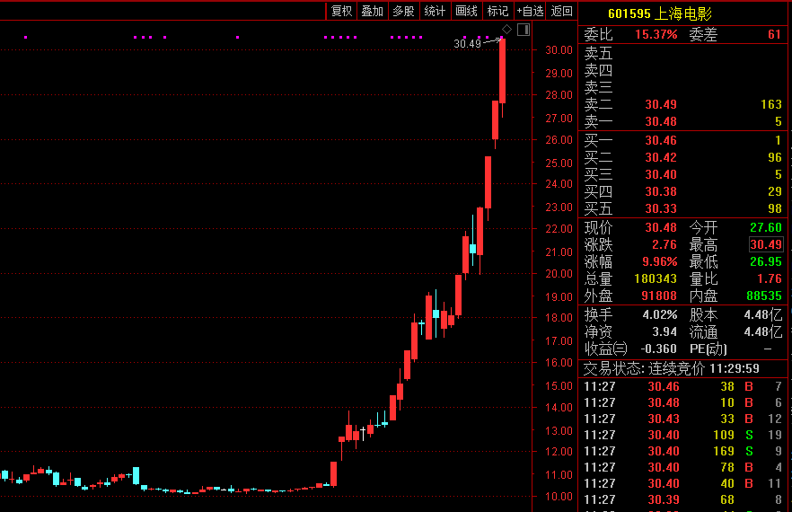 龙头股上海电影早盘再度涨停,这已是其近来连续第3个涨停,股价创6年多来新高。近1个月,上海电影累计飙涨逾191%。