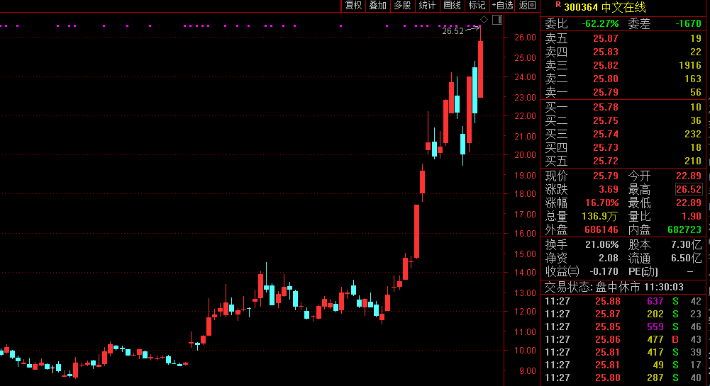 个股方面,市值188亿的中文在线一度20%涨停,创7年多来新高(复权,下同),华策影视、捷成股份、掌阅科技、视觉中国等涨停或涨超10%。