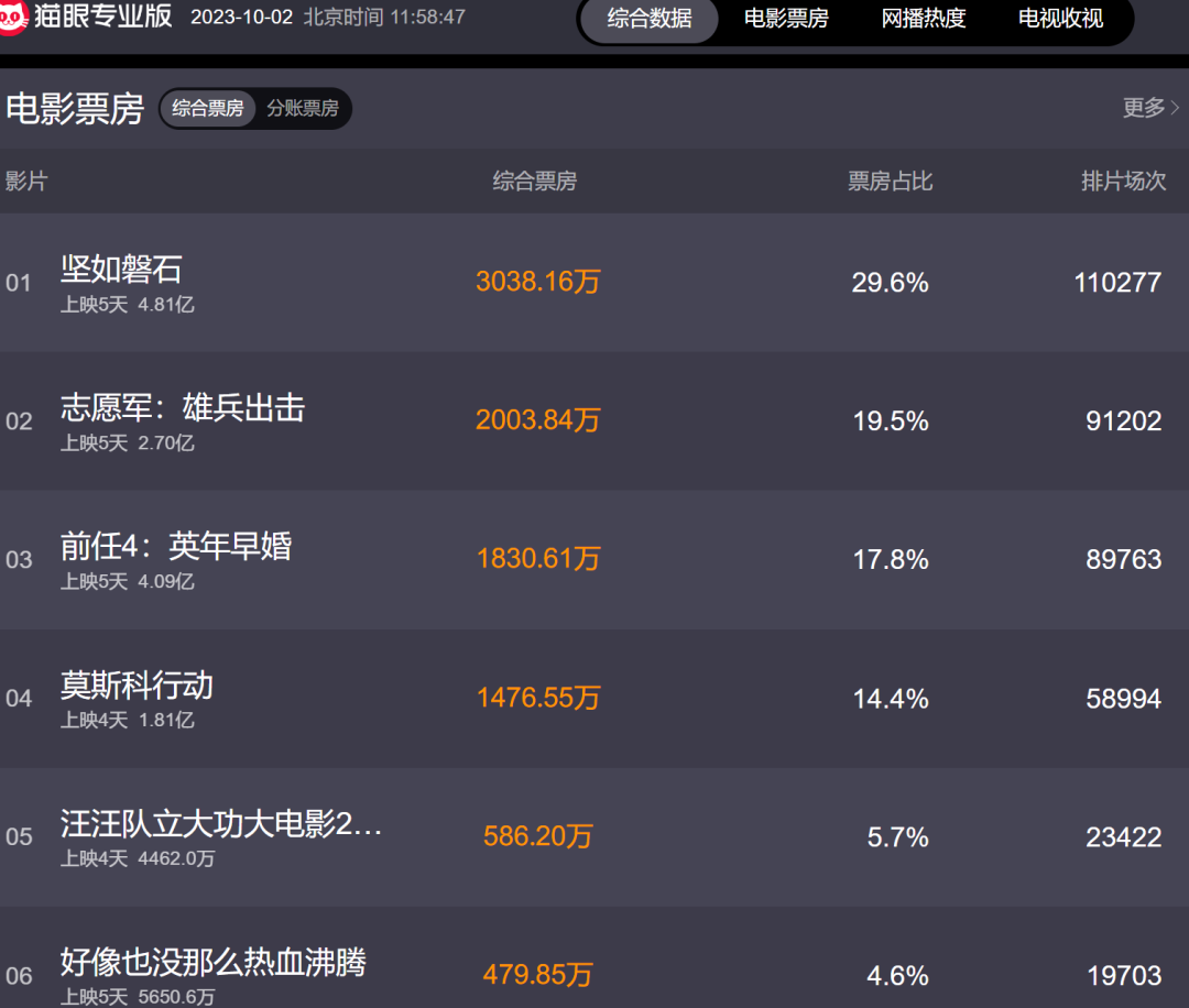 今年中秋国庆档共有12部影片集中上映。截至发稿,张艺谋导演的电影《坚如磐石》票房最高,为4.81亿元,反超《前任4:英年早婚》,而陈凯歌导演的《志愿军:雄兵出击》则以2.7亿元票房排名第三。