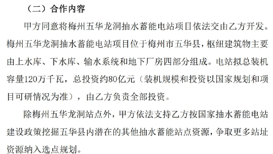 根据文山电力公告显示,全资子公司调峰调频公司与广东省五华县政府签订《合作推进梅州五华龙洞抽水蓄能电站项目开发建设框架协议》,五华县政府同意将梅州五华龙洞抽水蓄能电站项目依法交由子公司开发。电站拟总装机容量120万千瓦,总投资约80亿元,由子公司负责全部投资。同日公司还公告,梅州抽水蓄能电站二期项目主体工程开工,该项目同样由调峰调频公司投资建设。