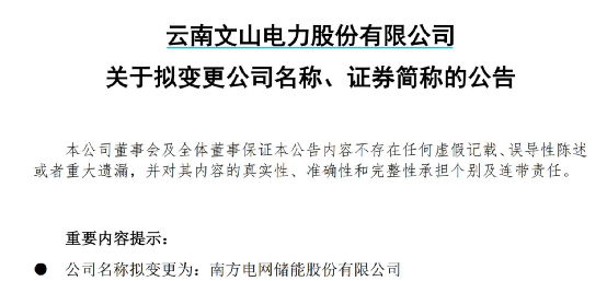 值得一提的是,文山电力还在9月5日公告宣布,拟变更名称为“南方电网储能股份有限公司”,简称为“南网储能”。随后,公司股价也在第二日一字板涨停。