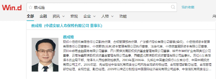 Wind信息显示,蔡成维出生于1969年,现任中信信托副总经理、合规管理部总经理,并任中信锦绣董事长、中信聚信执行董事等多个职务,此前曾在菏泽市检察院、建行山东分行、中期投资等多地任职。