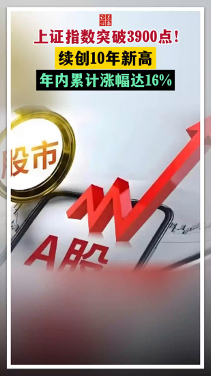 上证指数突破3900点!续创10年新高 年内累...
