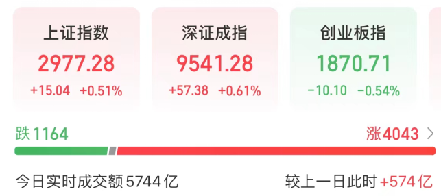 上午收盘,上证指数上涨0.51%,深证成指上涨0.61%,创业板指下跌0.54%。逾4000只个股上涨,上午A股成交额显著放大,达到5744亿元。