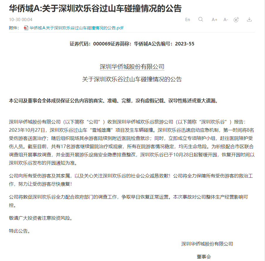 10月30日凌晨,华侨城A公告,收到深圳华侨城欢乐谷旅游公司(以下简称“深圳欢乐谷”)报告:10月27日,深圳欢乐谷过山车“雪域雄鹰”项目发生车辆碰撞。深圳欢乐谷迅速启动应急机制,第一时间将8名受伤游客送医治疗;随后组织现场其余游客陆续到附近医院检查就诊;同时,立即成立专项陪护小组,赶往医院陪护受伤人员。截至目前,共有17名游客继续留院治疗或观察,所有在院游客情况稳定,均无生命危险。为积极配合市区联合调查组开展事故调查,并全面开展游乐设施安全隐患排查整改,深圳欢乐谷已于10月28日起暂缓开园,恢复开园时间以深圳欢乐谷发布的开园通知为准。