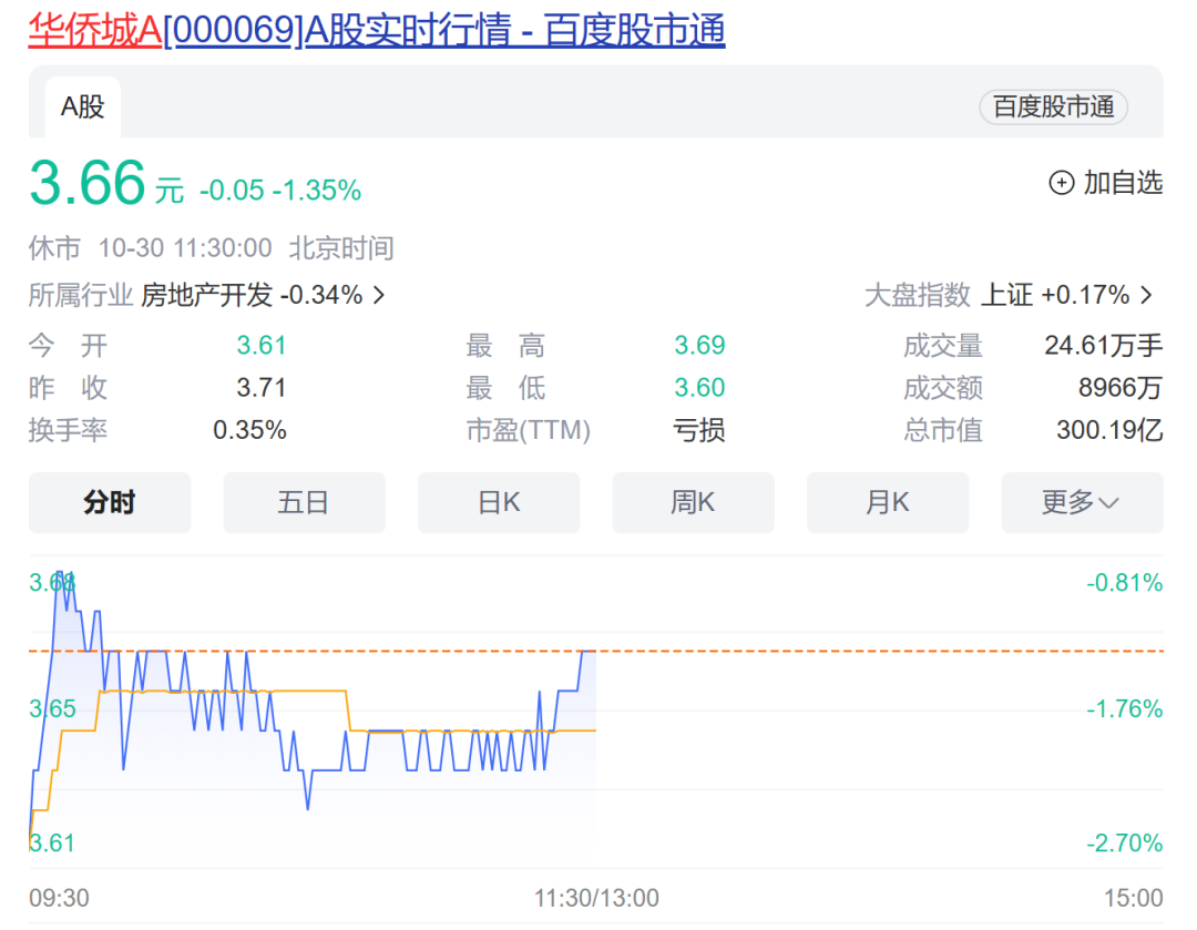 今日华侨城A低开,早间集合竞价期间跌2.7%,截至午间收盘报跌1.35%,公司总市值300.19亿元。