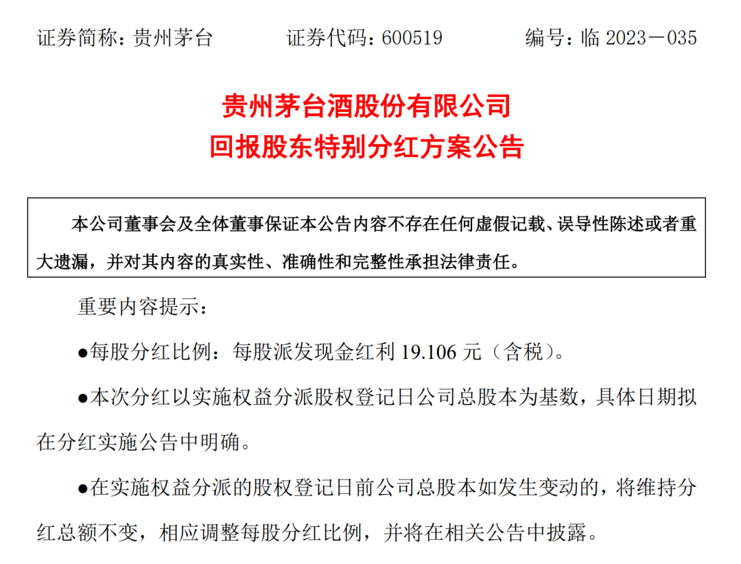 利好来啦!茅台时隔一年再实施大手笔特别分红,拟每股派发现金红利19.106元。