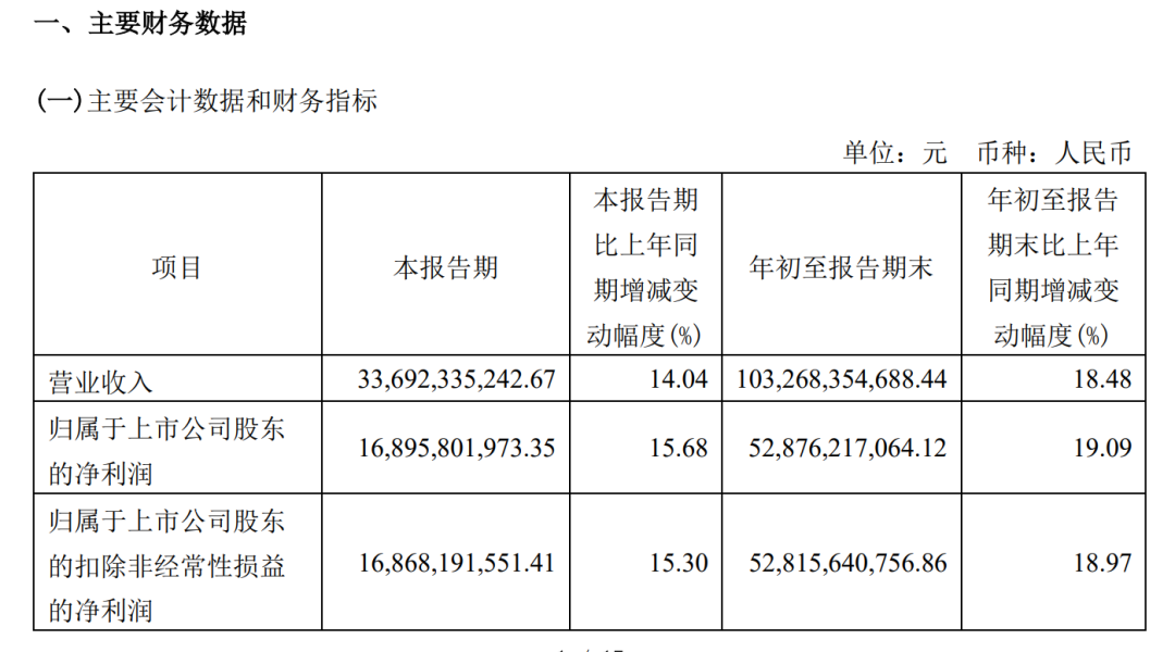 贵州茅台此前发布的2023年三季报显示,公司前三季度贵州茅台实现营业收入首次突破千亿大关,达到1032.68亿元,同比增长18.48%,归母净利润528.76亿元,同比增长19.09%。其中营收、利润继续保持两位数增长,业绩确定性非常强,这也为贵州茅台的稳定分红提供强有力的支撑。