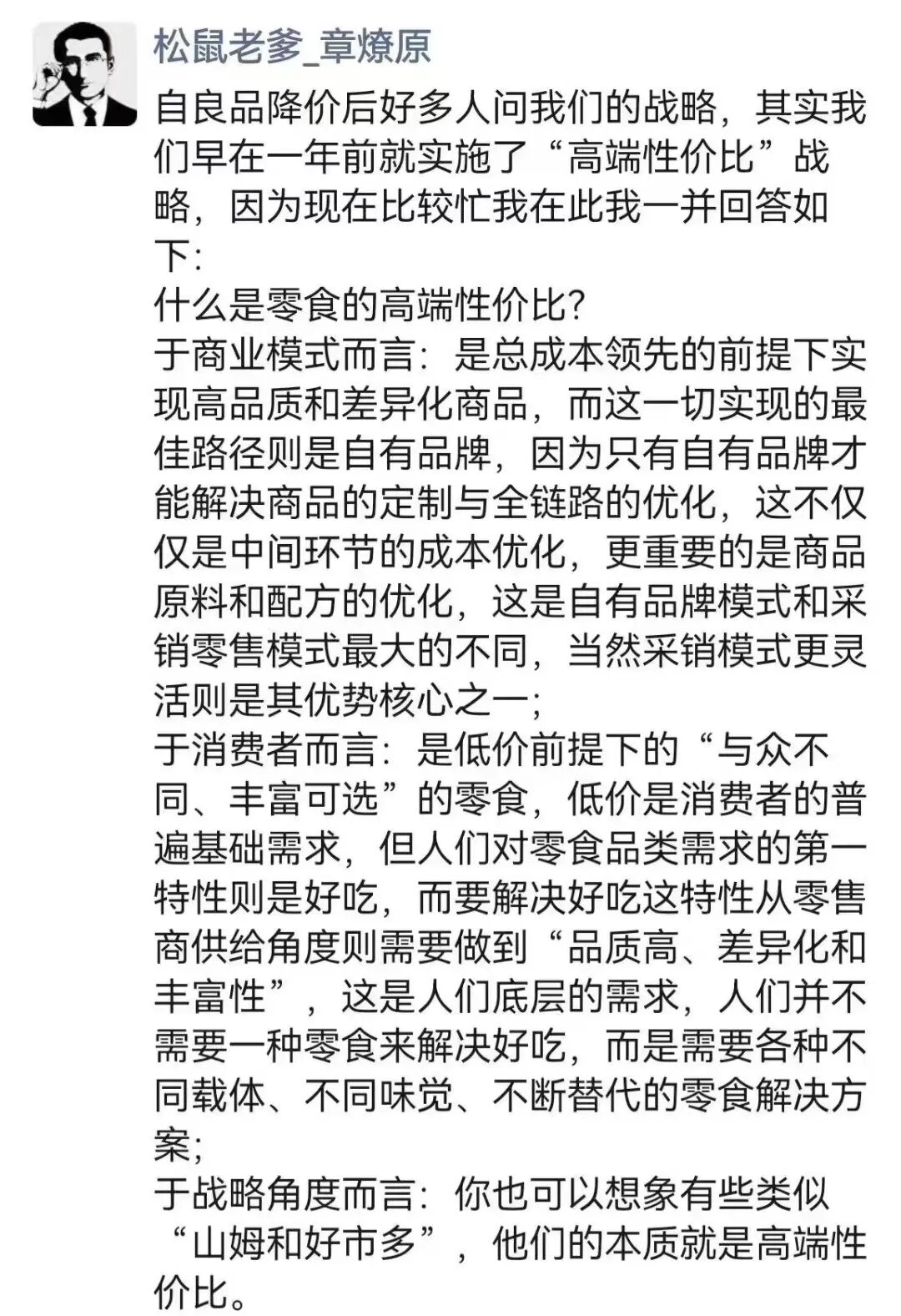 良品铺子官宣降价后,不少头部品牌也纷纷回应。三只松鼠创始人、董事长章燎源在朋友圈表示,公司早在一年前就实施了“高端性价比”战略。“零食的高端性价比类似‘山姆和好市多’。三只松鼠的使命是让好零食普及大众,围绕使命开放一切内外合作,实施全品类、全渠道的经营策略。所谓的竞争不是你死我活,而是在相互竞合中成就自我。”