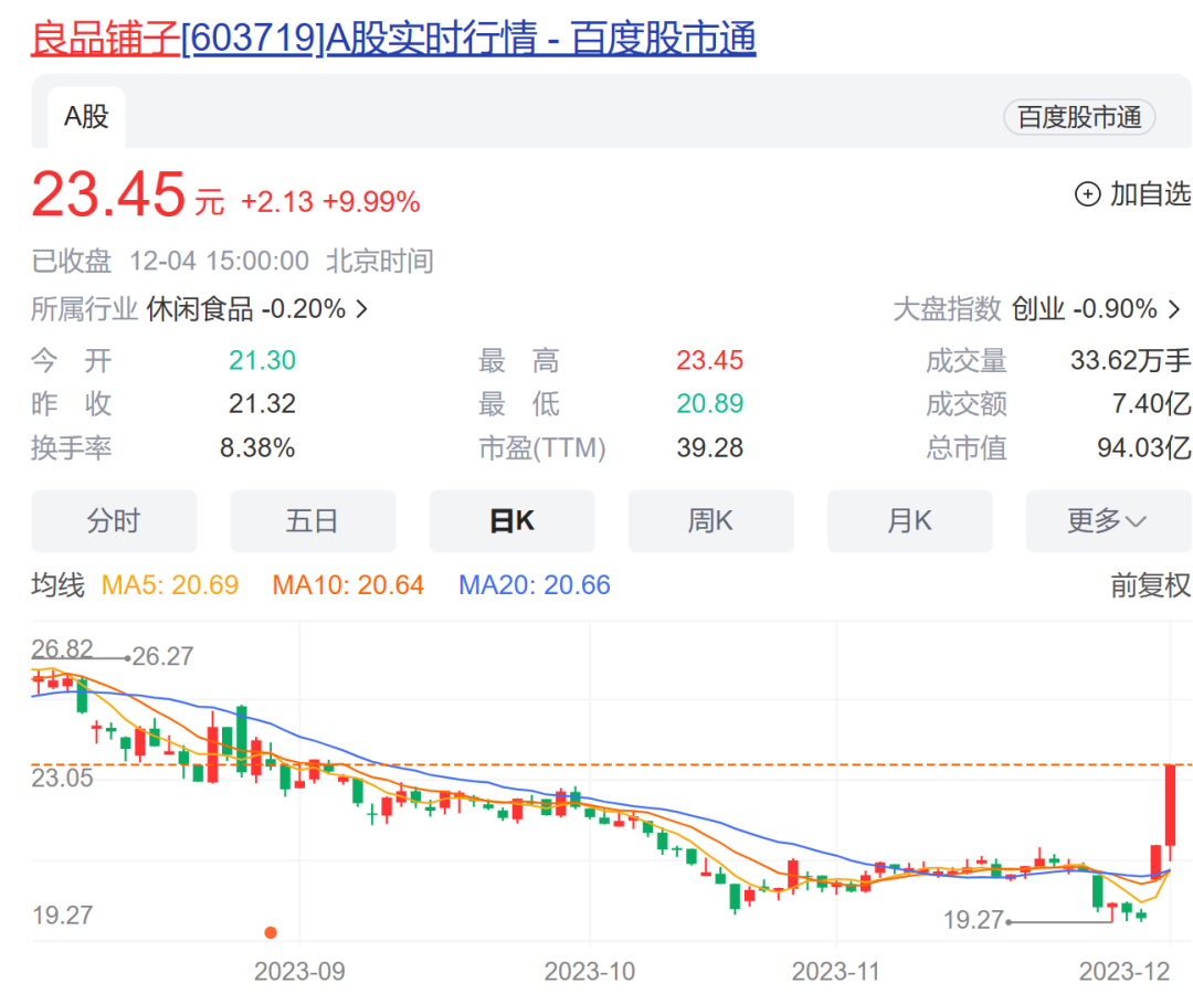 受到将实施大规模降价消息影响,良品铺子股价在12月1日高开5%,此后快速拉升,并维持涨停至收盘。今日,随着成交量的明显放大,良品铺子再次收获涨停,实现两连板,最新报收23.45元每股,总市值涨至94亿元。