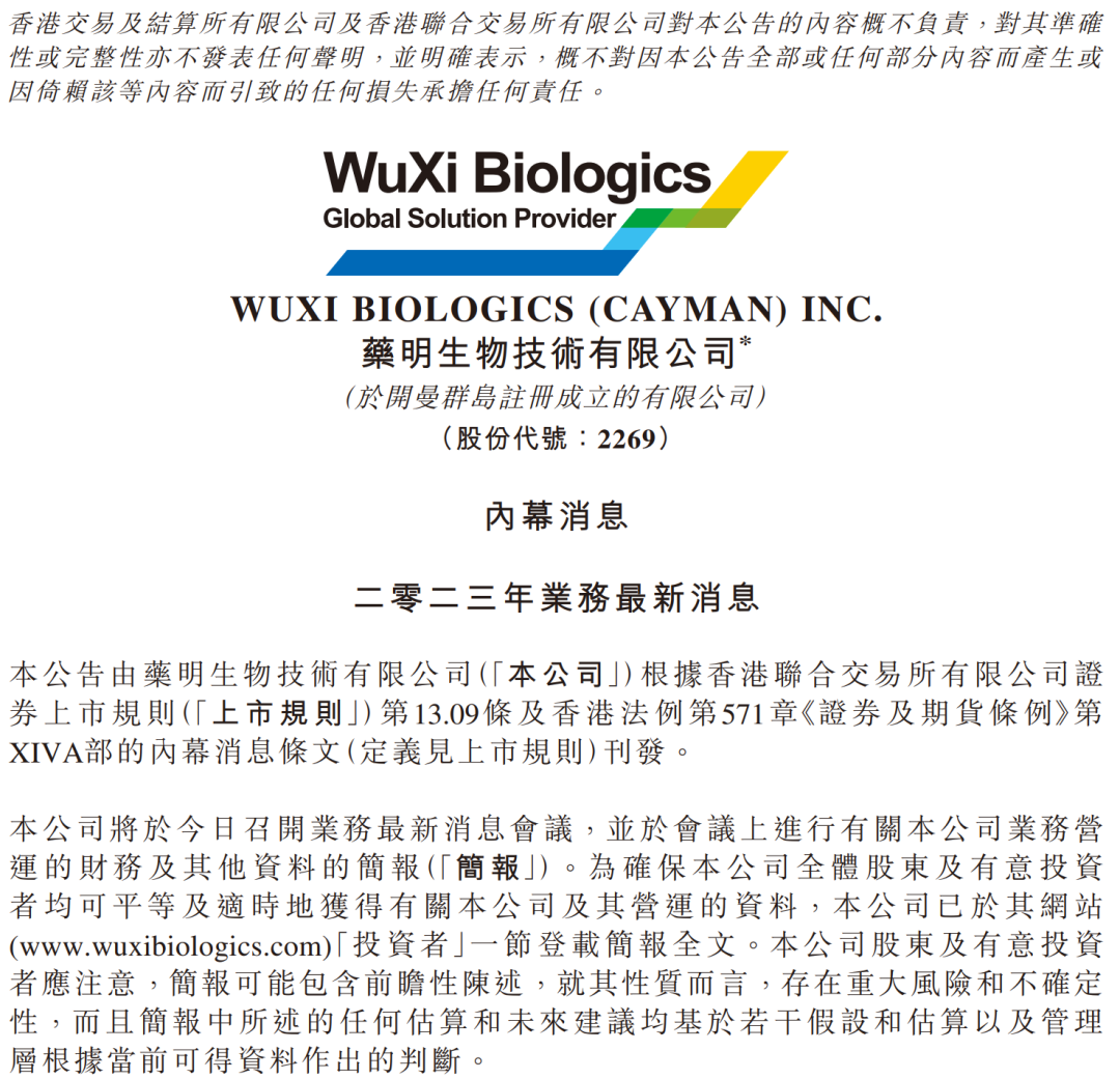 随后,一则“药明生物今日更新业绩展望,大幅下调2023年业绩预期,主要缘于此前过于乐观的增长目标,生物技术资金限制,地区复苏不平衡等。同时预计将于2024年实现盈亏平衡,较此前预期提前一年。”的消息在网络流传。据记者了解,药明生物确实在简报中表示部分业务不达预期,但“2024年实现盈亏平衡”存在误读。